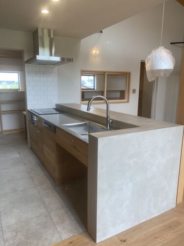 オーダーキッチン完成です。 こちらのキッチンはワークトップにステンレスを採用し、対面カウンターをモールテックスで仕上げたキッチンです。 面材はナラの突板を使用し、モールテックスとの相性抜群です。 モールテックスは下地に専門の職人さんが塗って磨…